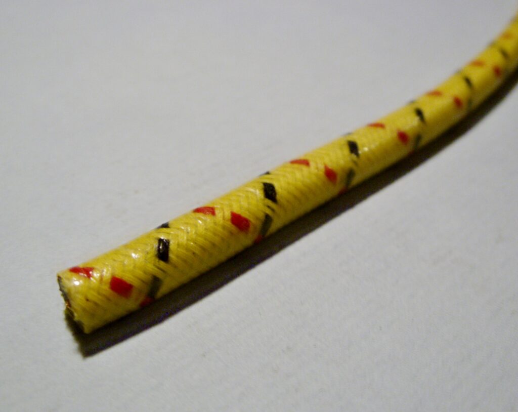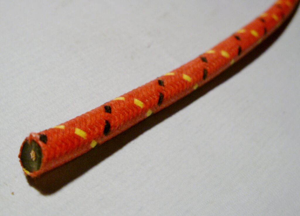 Lacquered red cotton braid with yellow and black tracers. Stranded copper core.
